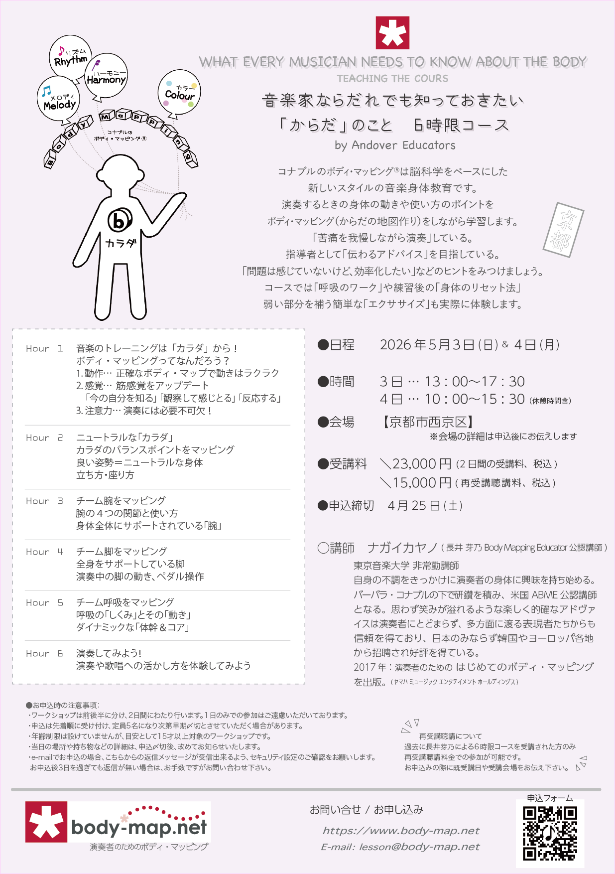 音楽家ならだれでも知っておきたい「からだ」のこと 6時限コース (2026年5月3&4日) 2026年05月6時限コース フライヤーのダウンロードはこちらから 6時限コース京都 音楽家ならだれでも知っておきたい「からだ」のこと 6時限コース【京都】受付中